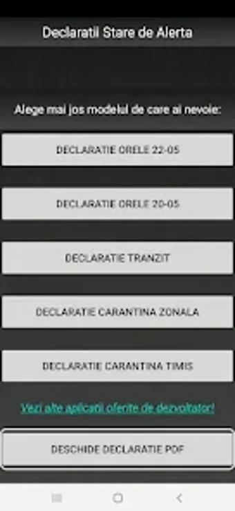 Declaratie pe propria raspunde to bezpłatna aplikacja na Androida opracowana przez Croitoru Sandu w kategorii Narzędzia i narzędzia. Aplikacja generuje deklaracje wymagane dla kwarantanny strefowej, przejazdu między miejscowościami oraz deklaracje nocne. Możesz przedstawić deklaracje za pomocą opcji "Prezentuj aktualną datę deklaracji" lub zapisać je wcześniej w formacie PDF i otworzyć z aplikacji lub przeglądarki PDF. Aplikacja ma opcję ustawienia daty ręcznie, a sprawdzanie dokładności deklaracji można wyłączyć z menu, jeśli jest to wymagane.
